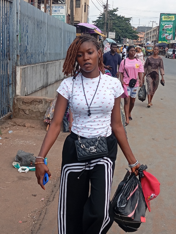 A woman with brown braids walks toward the camera. She wears a white t-shirt with red cherries, black track pants, a black Chanel purse, and multiple bracelets. She carries a black plastic bag and a red hat in her right hand and a blue cell phone in her left. Behind her, other pedestrians walk on a city street with buildings, street signs, and parked vehicles. The scene has a grainy texture.