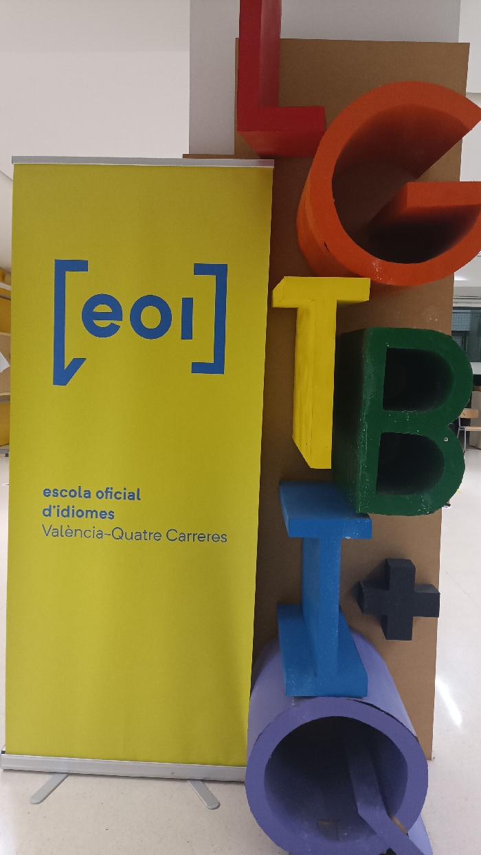A yellow pull-up banner stands left of a colorful, three-dimensional letter display in an indoor setting. The banner, supported by a silver-colored base, features the blue text "[eoi]" at the top, and "escola oficial d'idiomes València-Quatre Carreres" at the bottom. To the right, large, multi-colored block letters spell out "LGTBIQ+". The letters are arranged vertically on a brown cardboard-like backing: a red "L", an orange "G", a yellow "T", a green "B", a blue "I", a black plus sign ("+"), and a purple "Q" shaped like a cylindrical pipe. The location is identified as "Escola Oficial d'Idiomes València-Quatre Carreres" in Valencia, Spain. The background shows a plain white wall and a light-colored floor.