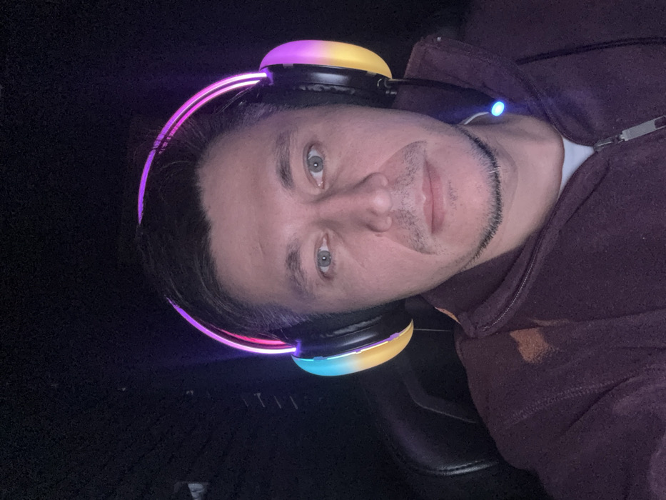 The image displays a male individual in a low-light indoor environment, presumably within the city of Tashkent, Uzbekistan. The subject, an adult male with short dark hair, light-colored eyes, and light stubble on his chin and upper lip, is positioned facing the camera with a neutral expression. He is wearing over-ear headphones that exhibit active multicolored LED illumination, with the headband glowing purple and pink, and the earcups displaying a gradient of blue, yellow, and orange. A small blue LED, consistent with an active microphone, is visible near his lower jaw. The man is dressed in a dark reddish-brown zippered fleece jacket worn over a white inner layer. The background is predominantly dark and indistinct, with the faint outline of a chair's back visible behind the subject's left shoulder.