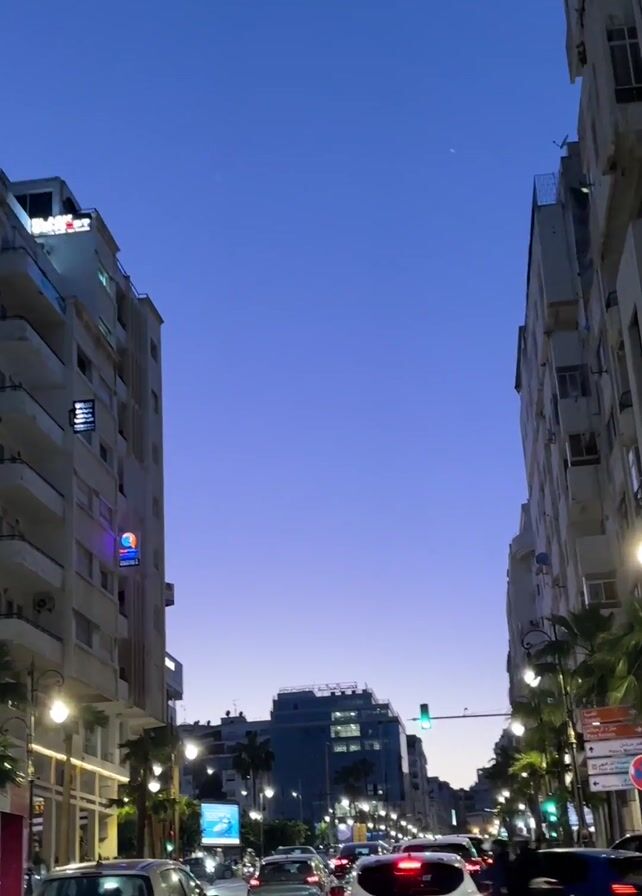 The video depicts a city street at dusk with the camera moving forward, likely from a car. Buildings line both sides of the street, and there are palm trees along the sidewalks. Cars are on the road, moving in both directions. Streetlights illuminate the scene. The sky is a clear gradient of blue to violet.