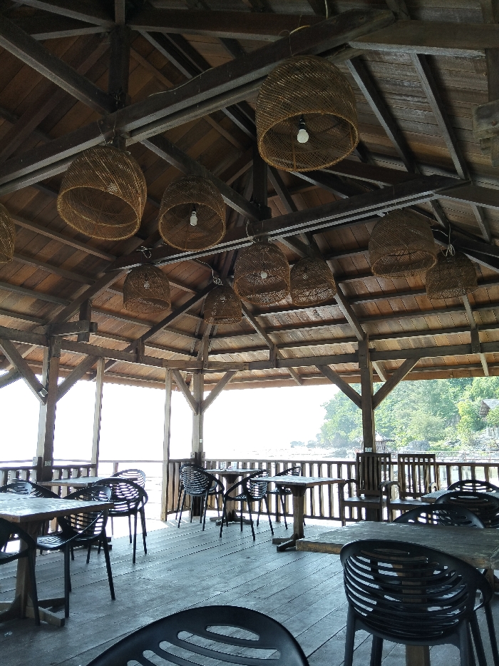 An elevated, open-air, wooden-framed structure, likely a dining establishment, is depicted in Meunasahbale, Indonesia