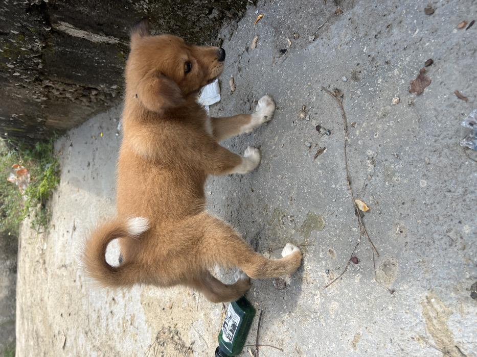 - "A medium-sized, reddish-brown puppy with white paws and a curled tail is depicted standing on a light grey concrete surface in Lokoja, Nigeria" by FM-njRDH2, licensed under CC BY 4.0