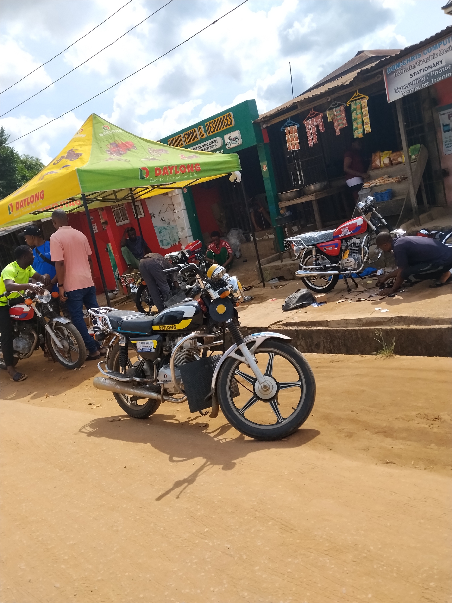 The image depicts a scene in Umuode, Nigeria, showcasing a roadside motorcycle repair area. Several Daylong brand motorcycles are visible, some parked and others undergoing repairs. People are gathered around, some engaged in conversation and others working on the bikes. A Daylong-branded tent offers shade to a group. Businesses line the street, including "UNIQUE-EMMA G. RESOURCES" and "DOM-CHRIS COMPUTER" (an institute/graphic design center). The ground is reddish-brown dirt. Hanging packets of goods indicate a small retail presence.