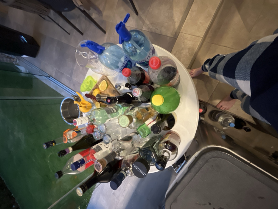 A round table overflows with bottles, lemons, and a citrus juicer. The bottles appear to be a mix of alcoholic beverages. Two seltzer bottles with blue nozzles sit near the back. A silver ice bucket holds more citrus. A sink partially surrounds the table's edge, and two water bottles sit inside the sink's basin. The lower legs and bare feet of a person wearing blue and white pajama pants are visible nearby. The background shows a tiled floor, a dark green surface, and parts of chairs.