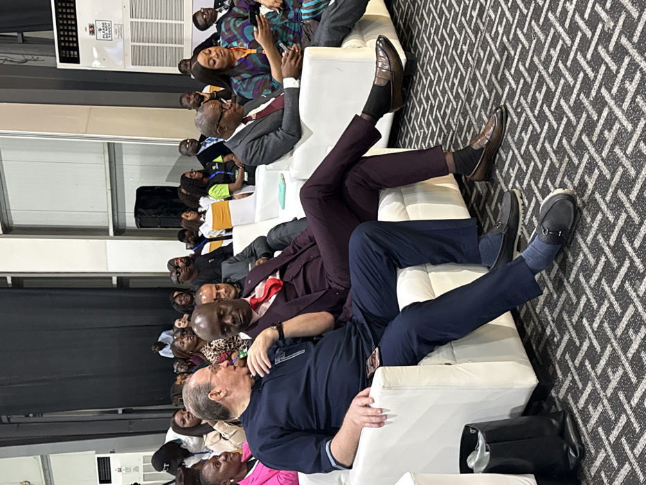 The image captures an indoor event in Alaguntan, Nigeria, featuring numerous seated attendees