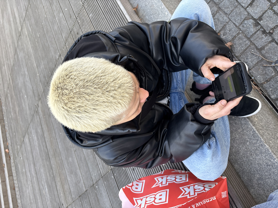 - "An individual with short, uniformly bleached platinum blonde hair is captured from an overhead perspective, seated or crouching outdoors in what appears to be an urban pedestrian area" by FM-WTbt02, licensed under CC BY 4.0