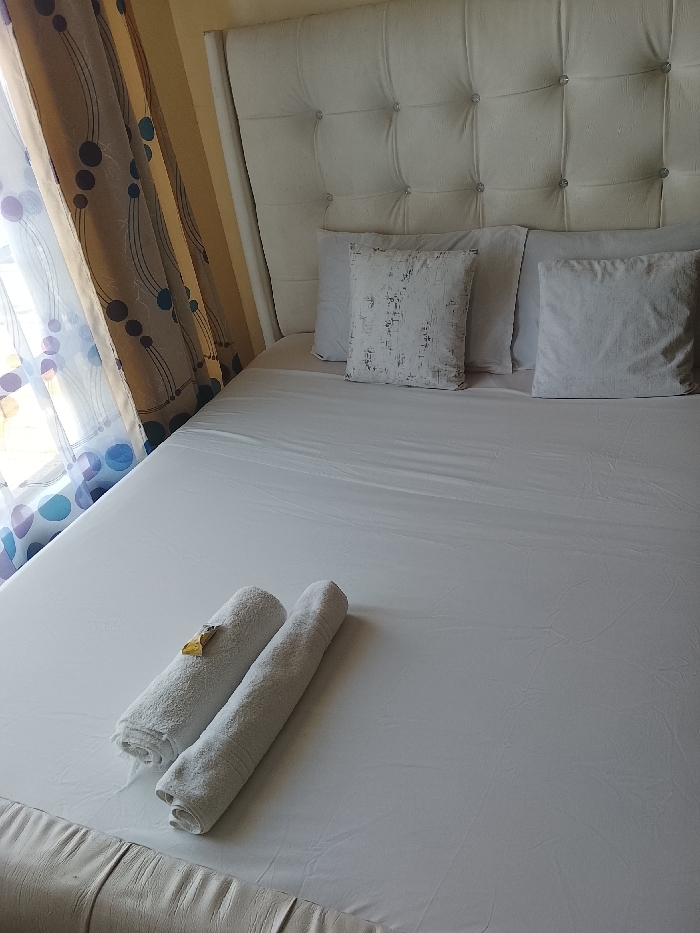 This image depicts a bedroom interior located in Gatongora ward, Kenya. The central subject is a large bed with a prominent white, tufted headboard featuring multiple button accents. The bed is neatly made with white sheets. Four pillows are arranged against the headboard: two standard white pillows, one white throw pillow with a subtle textured or patterned design, and another plain white throw pillow. At the foot of the bed, two white towels are rolled and placed side-by-side. A small, gold-colored, wrapped item rests on the leftmost rolled towel. To the left of the bed, a window is partially obscured by a sheer curtain adorned with blue, purple, and gray circular and wavy patterns. A darker, opaque curtain in brown/gold tones is visible behind the sheer curtain. The walls are a light, neutral color. No individuals or active interactions are present within the scene.