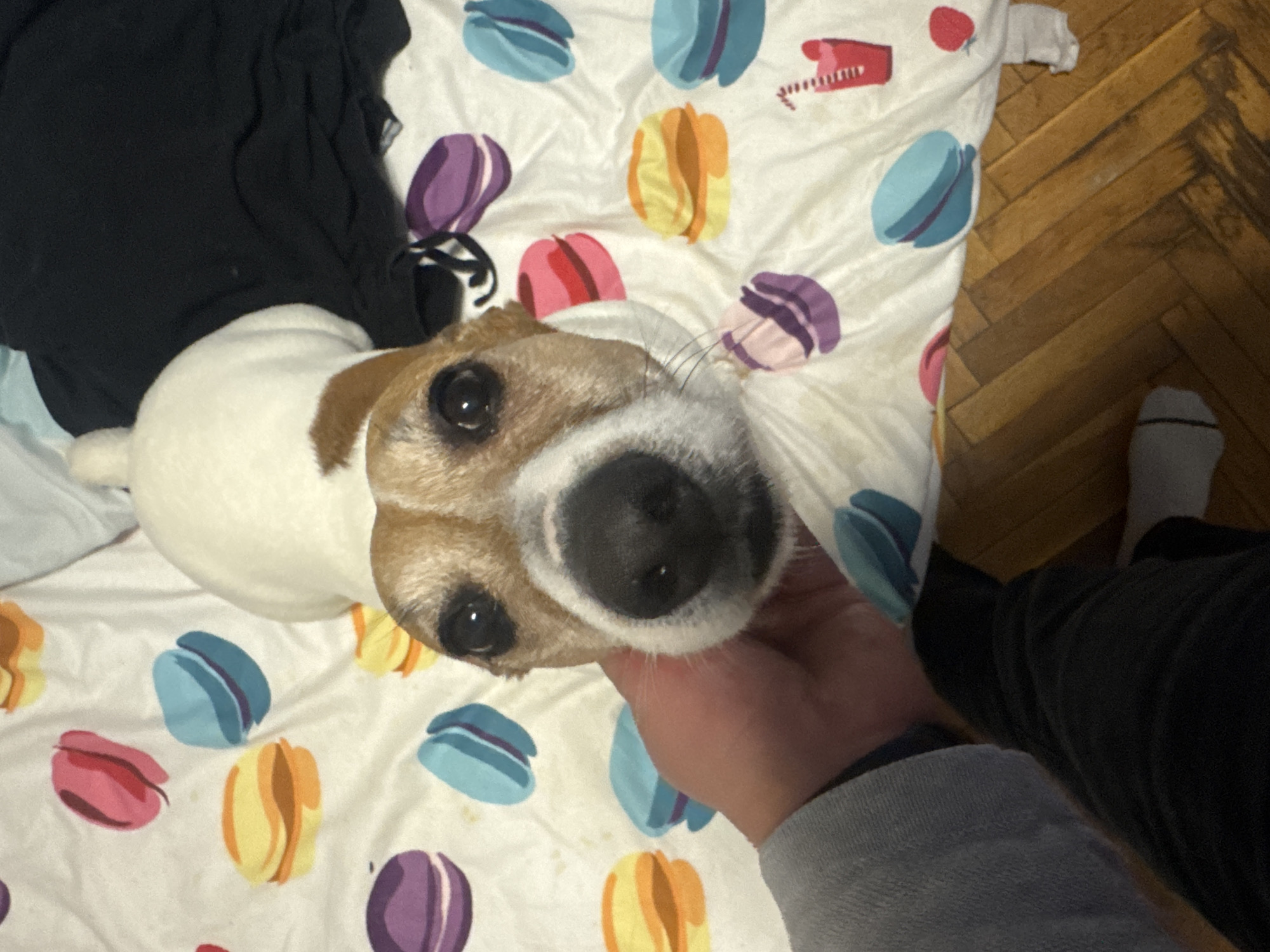 The image presents an indoor scene from a high-angle perspective, capturing a domestic dog and partial human presence on a bed. A small, short-haired dog, primarily white with tan-brown markings on its head and ears, is positioned with its head centered. Its dark eyes are directed towards the camera, and its black nose and muzzle are prominent. A human hand, with light skin tone and a grey sleeve visible, gently supports the dog's head and neck area. To the lower left, a portion of a human leg in black pants and a foot in a white sock are visible. The dog rests on a white bedsheet patterned with colorful macarons in shades of pink, blue, yellow-orange, and purple, alongside smaller red motifs including a beverage glass and a strawberry. A crumpled mass of black fabric is situated on the bed to the upper right of the dog. In the lower right corner, a light brown wooden floor with a distinct herringbone pattern is visible. The specific location within the city of Blagoevgrad, Bulgaria, is not discernible from the visual information provided.
