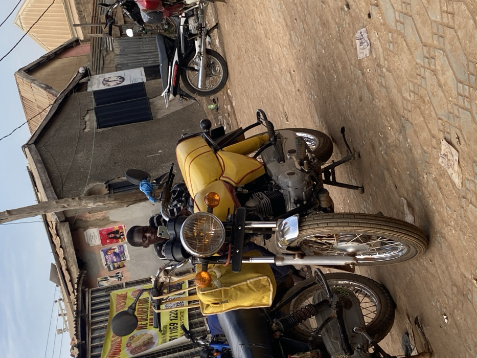 A man is sitting on a yellow motorcycle with delivery bags, looking at the camera. Behind him are buildings with advertisements and signs. There are other parked motorcycles nearby, and the ground is brick or pavement. The sky is visible in the upper left corner.