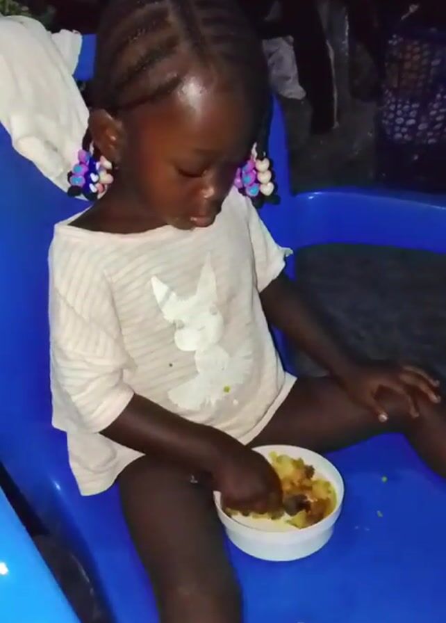 A small, dark-skinned child with braided hair and multicolored beads is sitting on a blue plastic chair, eating from a white bowl with a spoon