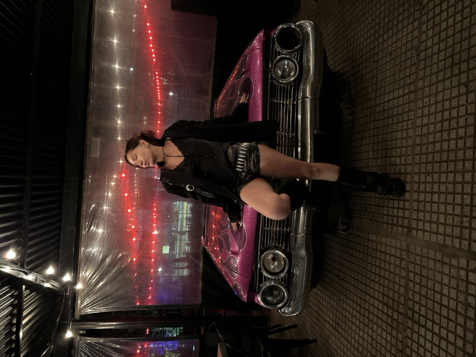 A young adult female poses at night within an outdoor section of a commercial establishment in an urban area of Buenos Aires, Argentina. She stands against a vintage car prop, which is a metallic pink vehicle with red flame graphics on its hood, a chrome grille, and quad headlights, resting on visible casters. The woman wears a black open blazer, a black satin camisole, camouflage shorts with a studded belt, and black knee-high boots. Her left foot is elevated, resting on the car's front bumper, and her hands are placed on the hood. Her head is tilted back and to the right, eyes closed, with a slightly parted mouth. The floor is a dark grid pattern. Overhead, a dark canopy holds multiple white string lights. The background features clear plastic windbreak sheeting, behind which a blurred horizontal line of red string lights, trees, and other distant urban lights are discernible.