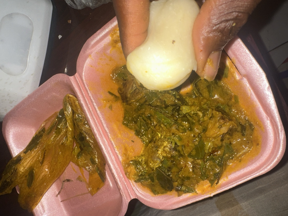 A person dips a portion of pounded yam into a container of leafy, green stew