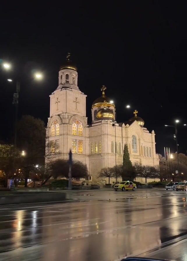 street scene at night in front of the Cathedral of the Assumption of the Virgin in Varna, Bulgaria. The street is wet from rain, reflecting the lights of the cathedral and streetlamps. Cars and a bus pass in front of the cathedral. People are seen standing near the bus. The cathedral is illuminated with lights, highlighting its architectural details and golden domes. The sky is dark, and the moon is visible.