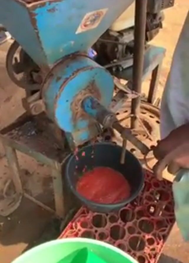 A man is feeding pieces of wood into a blue machine under a red and black umbrella, where red liquid is being dispensed into a black bucket. A child is visible in the background carrying a red bucket. The machine is sitting on a metal stand and powered by an engine to its right. The setup is outdoors, likely in a public or commercial area.
