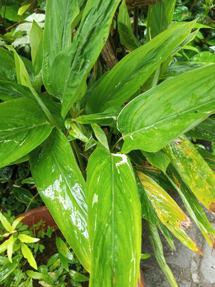 A verdant plant with large, glossy, lance-shaped leaves dominates the frame. The leaves display varying shades of green, some with yellowing edges and sporadic white variegation. Water droplets glisten on the leaf surfaces, suggesting recent rain. The plant is situated in a brown pot, with smaller, light green plants visible at the base. The background appears to be a garden setting, with other plants providing a soft, out-of-focus backdrop.