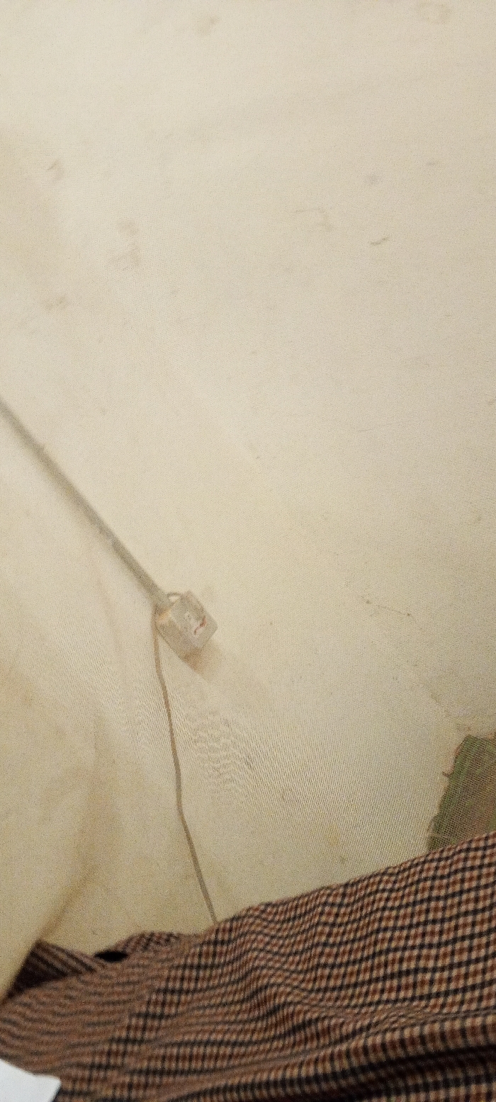 A tan surface features a light-colored cable extending to a translucent plastic cube. A brown and black checkered fabric is situated in the lower part of the frame, and a patch of green fabric is visible on the upper right corner. The tan surface exhibits scattered dark spots and variations in texture.