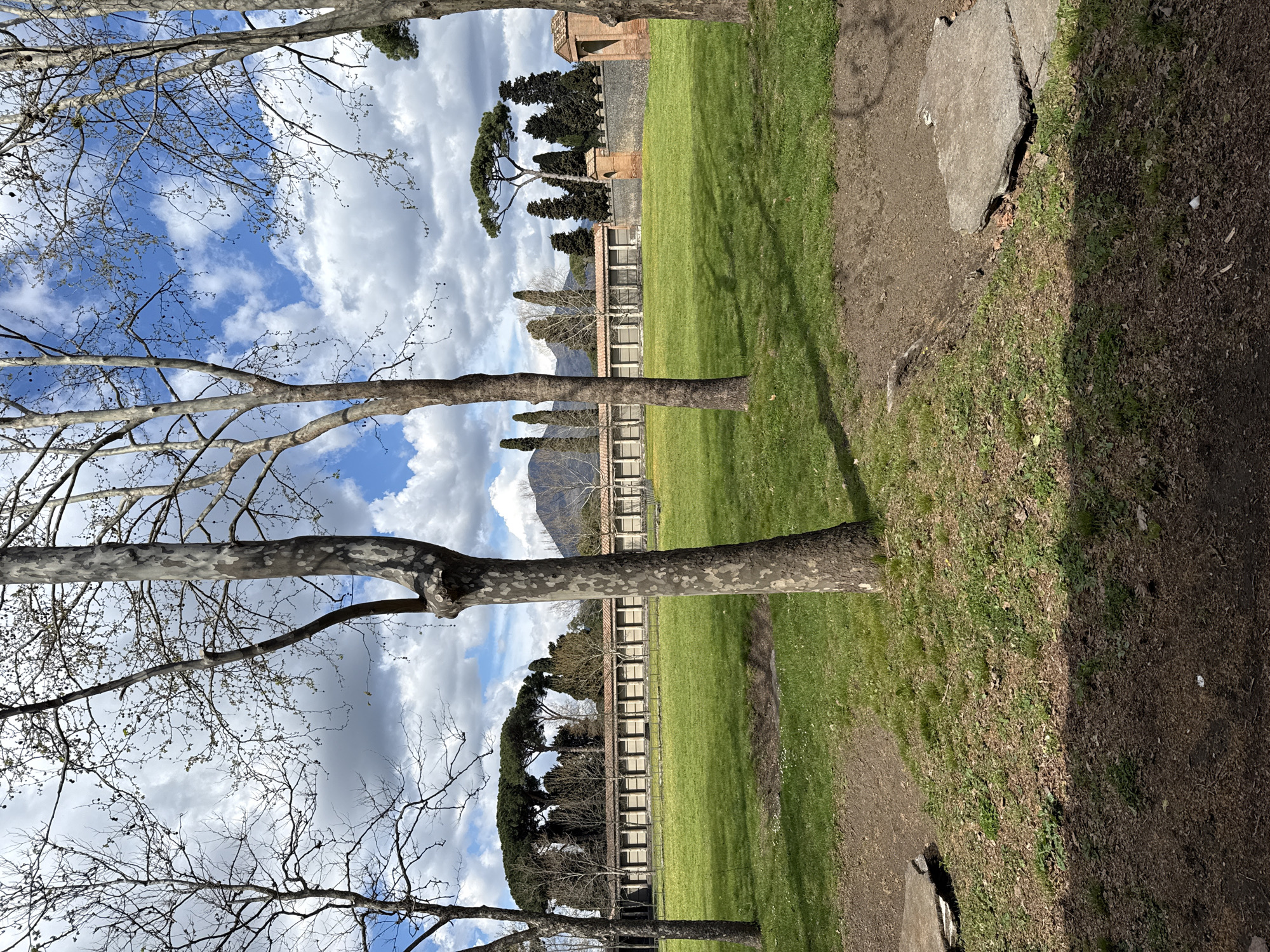 This image depicts the Great Palaestra in the ancient city of Pompeii, Italy. The scene is an outdoor, wide-angle view captured on a partly cloudy day. In the foreground, the ground consists of dark brown soil and patchy, sparse green grass, with remnants of light-colored, irregular concrete or stone slabs partially embedded. Several tall, bare-branched trees, likely plane trees, with mottled grey and light brown bark, rise vertically, partially framing the view. Their shadows are cast across the midground. The midground is dominated by a large, rectangular expanse of vibrant green grass, appearing well-maintained, with a few small white wildflowers visible. A muddy, dark depression is noticeable in the grass towards the left. In the background, a long, low-rise structure, identified as the portico of the Great Palaestra, extends horizontally across the frame. It features a series of light-colored, regularly spaced cells or niches beneath a reddish-brown tiled roof. To the right of this structure, a dark grey stone wall with crenellations is visible, incorporating a prominent arched gateway with complementary reddish-brown tiled turrets. Behind these structures, a line of dark green evergreen trees, including cypresses and stone pines, stands tall. In the far distance, a conical mountain, consistent with Mount Vesuvius, rises against the sky, its slopes appearing mostly bare. The sky overhead is a mix of bright blue patches and large, white cumulus clouds, interspersed with some darker grey cloud formations. No individuals or specific actions are discernible within the scene.