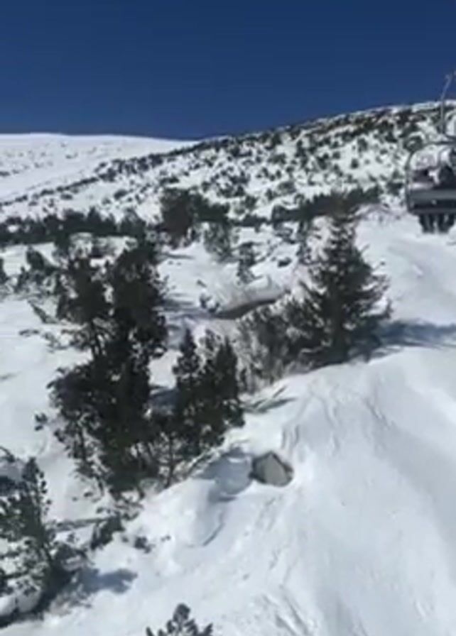 view from a ski lift ascending a snow-covered mountain on a sunny day. We see other skiers on a lift car passing by. The landscape consists of snowy slopes interspersed with small pine trees and bushes. The sky is clear blue with some white clouds. The camera's perspective is from within one of the ski lift cars.