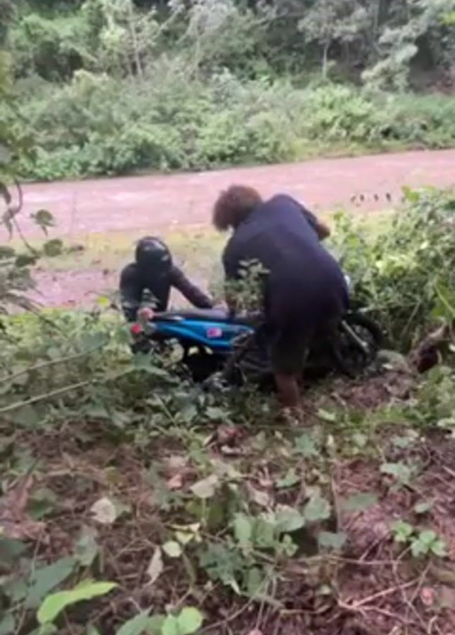 Two individuals are attempting to lift a fallen motorcycle near a riverbank. The motorcycle is partially obscured by dense vegetation and mud. One person, wearing a helmet, is kneeling and assisting with the front of the bike, while the other is standing and appears to be pushing from the rear. The surrounding environment includes lush green trees, bushes, and a muddy embankment near the river. The river itself is flowing with murky water.