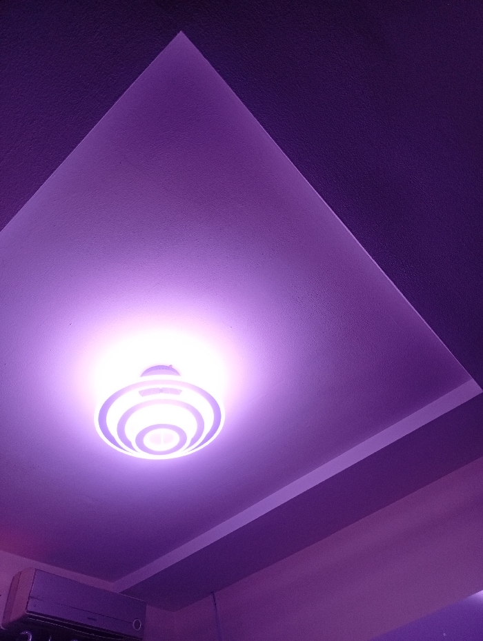 This is an interior photograph depicting a room in Los Angeles, United States of America. The scene is dominated by a purple ambient light. A circular, multi-ringed ceiling light fixture, emitting a bright white-purple glow, is centrally mounted within a rectangular recessed section of the ceiling. This lighter purple recessed area contrasts with the surrounding darker purple ceiling, which angles diagonally across the upper frame. In the lower-left corner, a white, rectangular wall-mounted air conditioning unit with visible vents and controls is partially captured. The walls are illuminated in varying shades of purple, and a distinct horizontal architectural beam or molding is visible across the middle right portion of the frame. No people or specific activities are present.
