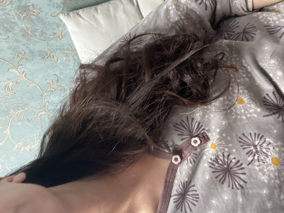An indoor scene in Khimki, Russia, shows the upper torso and head of an individual from a slightly elevated perspective. Long, dark brown, wavy hair cascades over the individual's right shoulder and chest. The individual is wearing a grey long-sleeved top featuring a dark brown/maroon V-neck placket with two small, light-colored, flower-shaped buttons. The fabric displays a repeating pattern of stylized dark purple-brown dandelion-like seed heads with yellow-orange centers and scattered white accents. In the background, a light blue wall is visible, covered with wallpaper adorned with a light-gold/beige intricate floral and vine pattern. To the right of the individual, a portion of a white pillow is discernible.