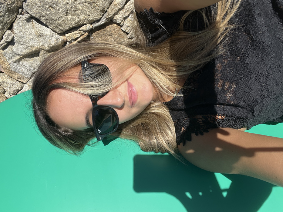 A female subject is depicted in a close-up, head-and-shoulders portrait, consistent with a selfie, situated in the city of Oliveira de Frades, Portugal. She has long, wavy, blonde hair and wears dark Ray-Ban Wayfarer-style sunglasses and a black lace top with cap sleeves. Her lips are slightly parted, indicating a faint smile, and she looks directly at the camera. Strong, direct sunlight illuminates her from the upper left, casting a distinct shadow of an unidentified object, consistent with a smartphone, on the vibrant green surface to her lower left. The background is divided, with a solid green surface occupying the left portion and a rough-hewn stone wall, composed of irregular grey and beige stones, forming the right portion.
