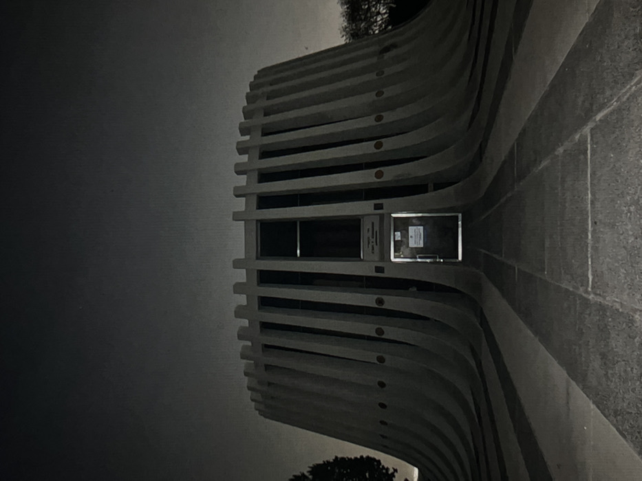 An architectural structure features a series of horizontal, curved beams that create a rhythmic pattern. The building has a central opening, possibly an entrance, with a smaller rectangular window-like element beside it. The scene is in grayscale, emphasizing the lines and shapes of the structure. The sky is visible in the background, contrasting with the geometric form of the building. Part of the ground or pavement is visible on one side.