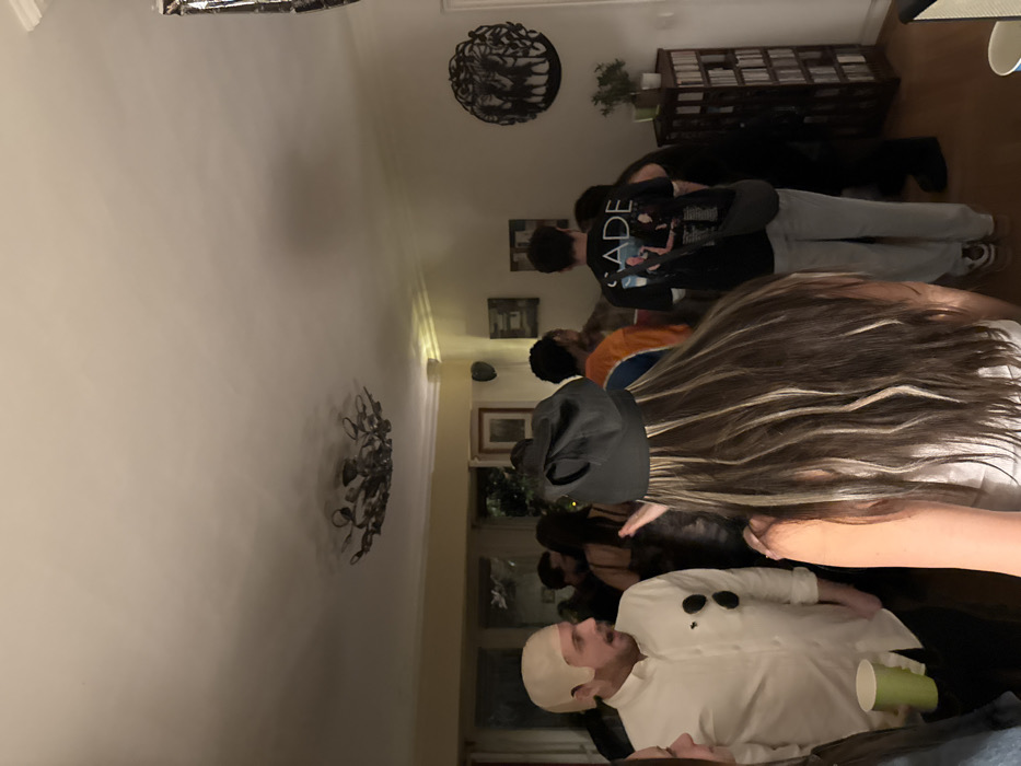 A gathering of people indoors, likely a party. The room is lit dimly. Several individuals are visible, including one wearing a white wig and a white shirt with sunglasses pinned to it, holding a green cup. Another person wears a backward baseball cap. Others are standing in groups further down the room. Wall decorations include metal sculptures and framed pictures. A dark cabinet sits against the far wall.