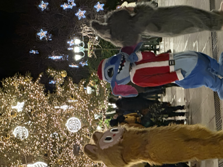 A Christmas tree with twinkling lights stands beside a sidewalk. Three costumed characters pose for a photo. In the foreground is a tan, mouse-like figure. Above it, a blue "Stitch" character wears a Santa suit. A grey animal costume is at the top of the photo. People walk along the sidewalk in the background. Star-shaped lights hang in the trees.
