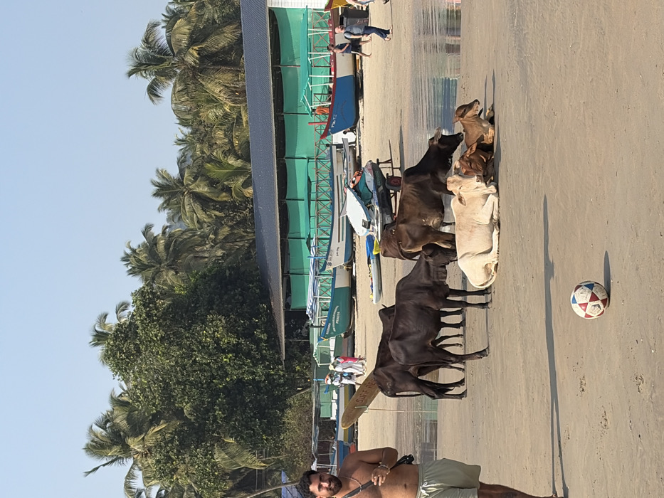 A man with a surfboard stands on a beach. Behind him, a herd of cattle rests on the sand, close to fishing boats and palm trees. A soccer ball sits nearby on the sandy ground. The scene captures a sunny day at a tropical location.