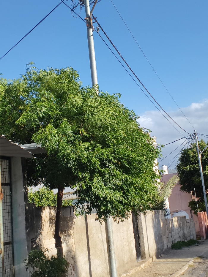 The image displays an outdoor scene in الشيخ حسين قرية, Jordan, under a clear blue sky with some scattered white clouds in the upper right quadrant. A tall, slender, grey utility pole stands prominently in the mid-ground, extending from the bottom to the top of the frame, supporting multiple dark electrical wires that crisscross the sky. A large, verdant tree with dense green foliage dominates the left and central mid-ground, partially obscuring a section of a weathered, light-colored concrete or stone wall that runs horizontally across the frame. To the far left, a partial view of a structure with a corrugated metal roof is visible. In the lower right, a dirt or unpaved path with a distinct curb line is present. Beyond the wall on the right, portions of buildings, one exhibiting a pale pink hue, and additional green vegetation, including a visible palm frond, are discernible. No human figures or discernible actions are present.