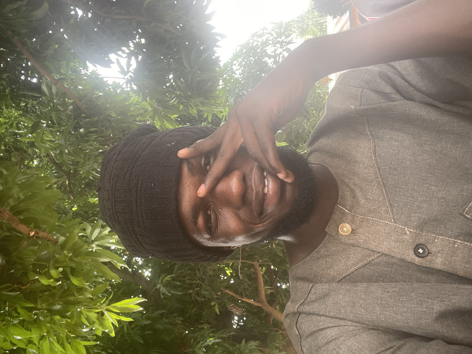 A dark-complexioned male individual is depicted in a medium shot, reportedly located in Akwanga, Nigeria. He wears a black knit beanie and a grey tunic-style shirt featuring distinct light-colored stitching and two large, mismatched buttons on the front placket: one light brown and one dark brown. The man has a short, dark beard and is smiling, revealing his upper teeth. His right hand is raised to his face, with two fingers extended in a "V" gesture, partially obscuring his right eye. The background is dominated by lush green foliage from a tree, with bright sunlight filtering through the leaves from the upper right, creating luminous spots. A faint structure with a corrugated metal roof is visible in the distant background to the right, adjacent to the partial shoulder and head of another individual.
