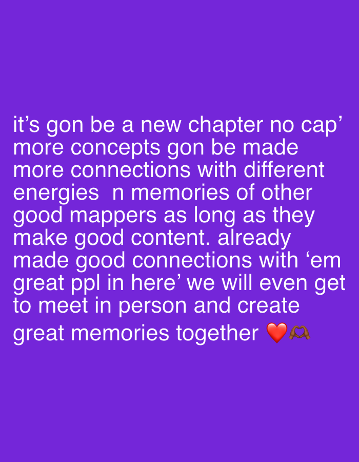 A text message on a solid purple background expresses excitement for a new chapter. It highlights the creation of new concepts, connections with diverse energies, and memories with good mappers who consistently produce quality content. The message indicates existing strong connections with people in the group, with the hope of meeting in person to create great memories together, symbolized by a red heart and hands forming a heart shape.