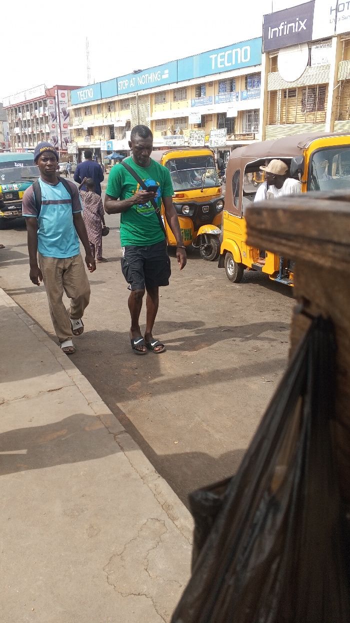 The image displays an urban street scene in Maiburiji, Nigeria, under bright daylight. In the immediate foreground, a concrete sidewalk occupies the lower-left quadrant, exhibiting minor stains. A dark, out-of-focus object, possibly a refuse bag, partially obscures the lower-right corner. Two adult males are walking leftward on a paved road surface. The central figure wears a green short-sleeve t-shirt with a graphic design, black cargo shorts, and black Nike slide sandals. He carries a dark shoulder bag across his body and is looking down at a blue smartphone held in both hands. The second male, positioned to the left and slightly behind the first, wears a light blue and dark blue striped short-sleeve shirt, khaki-colored trousers, white Adidas slide sandals, and a dark beanie. He carries a dark backpack and his gaze is directed towards the camera's perspective. A third individual in a patterned garment is partially visible walking behind the second male. The midground features several vehicles. Two yellow motor tricycles, commonly known as Keke Napep, are prominent on the road; one is positioned left of the central male, and another to the right, with a driver wearing a beige cap visible inside. A green commercial van or bus is partially visible on the far left side of the frame. The background consists of multi-story commercial buildings lining the street. A large blue billboard sign prominently displaying "TECNO" and the slogan "STOP AT NOTHING" spans across the upper facade of a central building. To its right, another sign for "Infinix" is visible. Shadows are cast on the ground, indicating the presence of direct sunlight.