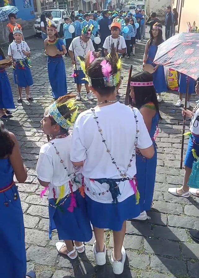 A procession of children and adults moves along a cobblestone street. They are dressed in traditional clothing: royal blue dresses and skirts, white t-shirts, and decorative headdresses and necklaces with colorful feathers and beads. Many hold small, shallow, wooden bowls or thin wooden staves. A few carry produce: a bundle of plantains or a bunch of what appear to be small yellow fruits. Most participants look straight ahead, but some are glancing at each other. The group is passing buildings on either side of the street. A pharmacy is visible in the background. There are spectators watching the procession. The day is bright.