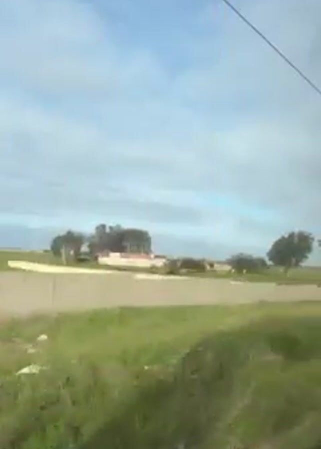 view from a moving vehicle, likely a train, of the landscape outside. The sky is blue with some clouds. A concrete barrier runs parallel to the vehicle's path. Beyond the barrier is a field with green grass and some yellow patches. There are scattered trees in the distance, and some buildings can be seen on the horizon. The camera is moving at a steady pace, and the overall impression is of a rural or suburban area.