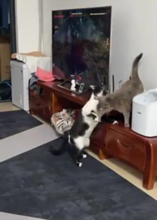 two cats in a room, presumably a living room. One cat is black and white and is standing on its hind legs, reaching up toward a large television screen that is displaying a video game with action and visual effects. The second cat is gray and is standing on a wooden media console below the television. There is a water fountain for pets and some other items on the console. The floor is covered with a gray and white geometric patterned rug. There is also a mini-refrigerator visible in the background to the left of the television. The room appears to be well-lit.