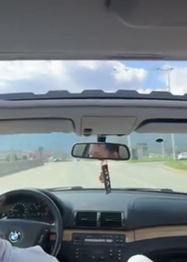 n interior car view of a BMW E46 driving on a road in what appears to be a city or town