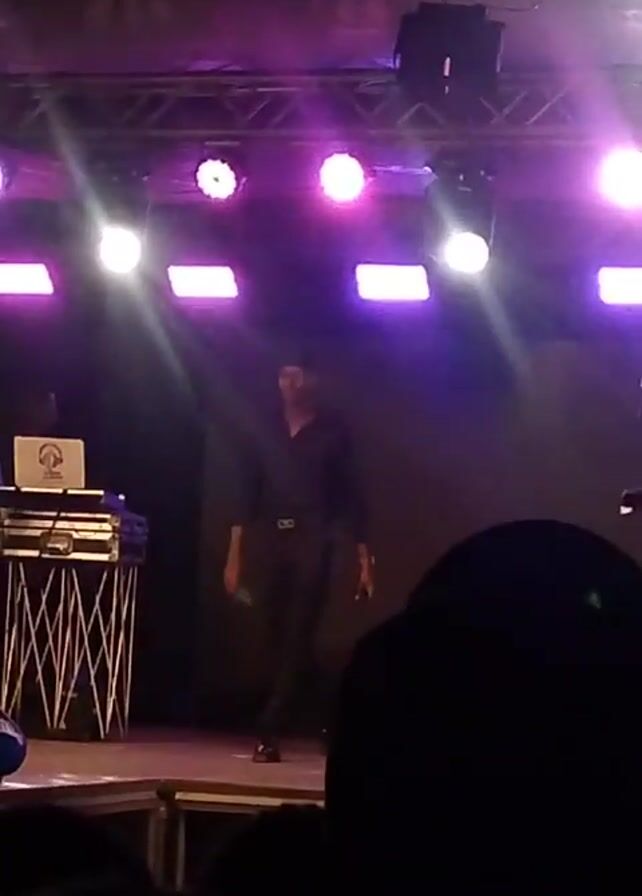 The video depicts a concert stage illuminated by various lights, including a DJ setup with a laptop, a drummer, and several people moving around the stage. A woman in a black dress appears to be speaking or singing into a microphone. The audience is visible as silhouettes in the foreground.