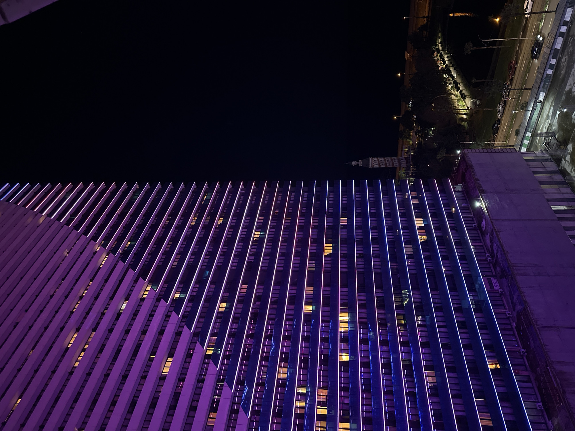 - "At night, an upward-tilted, wide-angle shot depicts a modern skyscraper in Batumi, Georgia, illuminated with vertical neon lights in shades of violet and blue" by FM-Abgu83, licensed under CC BY 4.0