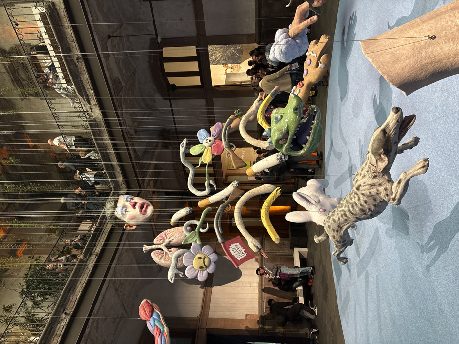 A whimsical art installation hangs in a building courtyard. Various colorful, cartoonish sculptures are suspended from thin wires: a dog, a dragon, flowers, anatomical organs, cigarettes, a clown's face, and hands. People view the art from below and from the surrounding balconies. The setting has traditional architectural elements.