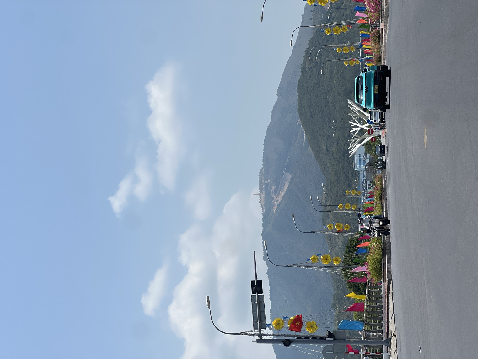 The image depicts a road in Nha Trang, Vietnam, adorned with colorful flags and yellow floral decorations hanging along the roadside. A light blue car is traveling on the road, followed by motorcycles. A mountain range rises in the background. Street lamps line the road. The sky is blue with scattered clouds. A modern white art installation stands along the side of the road.