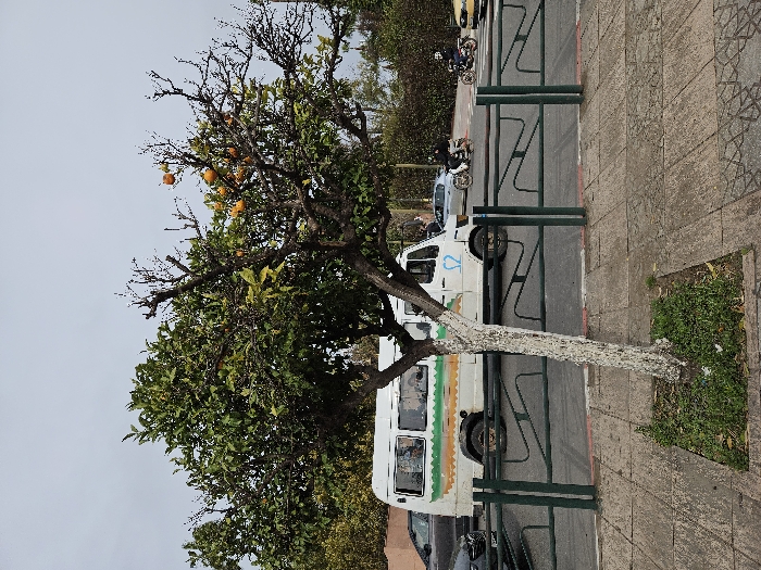 The image depicts an urban street scene in Marrakesh, Morocco, under an overcast sky. In the foreground, a prominent orange tree with a white-painted trunk stands within a square ground patch filled with green grass on a tiled pedestrian sidewalk. The tree has both dense green foliage and bare branches, with several ripe orange fruits visible. Separating the sidewalk from the street is a dark green metal barrier. Behind this barrier, a white Mercedes-Benz van, possibly a Sprinter model, with horizontal green and orange stripes on its lower body, is in motion from right to left. Figures, likely passengers, are visible through its windows. On the paved street, multiple vehicles are present: a dark grey sedan, two individuals riding motorcycles who appear to be wearing helmets, and the rear portion of a yellow taxi. The street features a red-painted curb line. Beyond the street, additional green foliage from trees or bushes is visible.