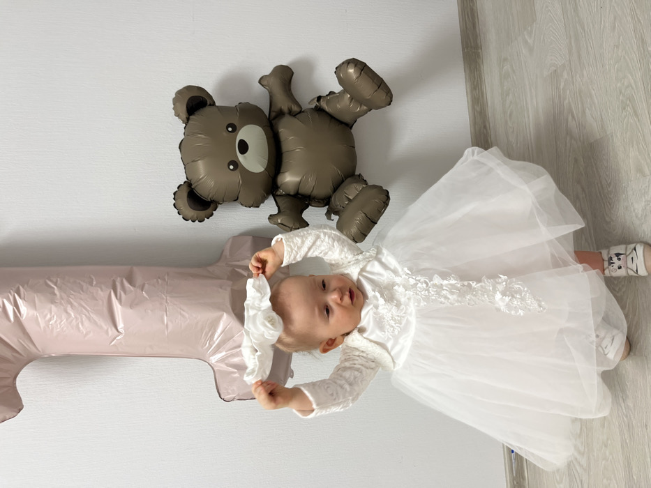 A baby in a white dress and cardigan sits next to a large pink number "1" balloon and a brown teddy bear balloon