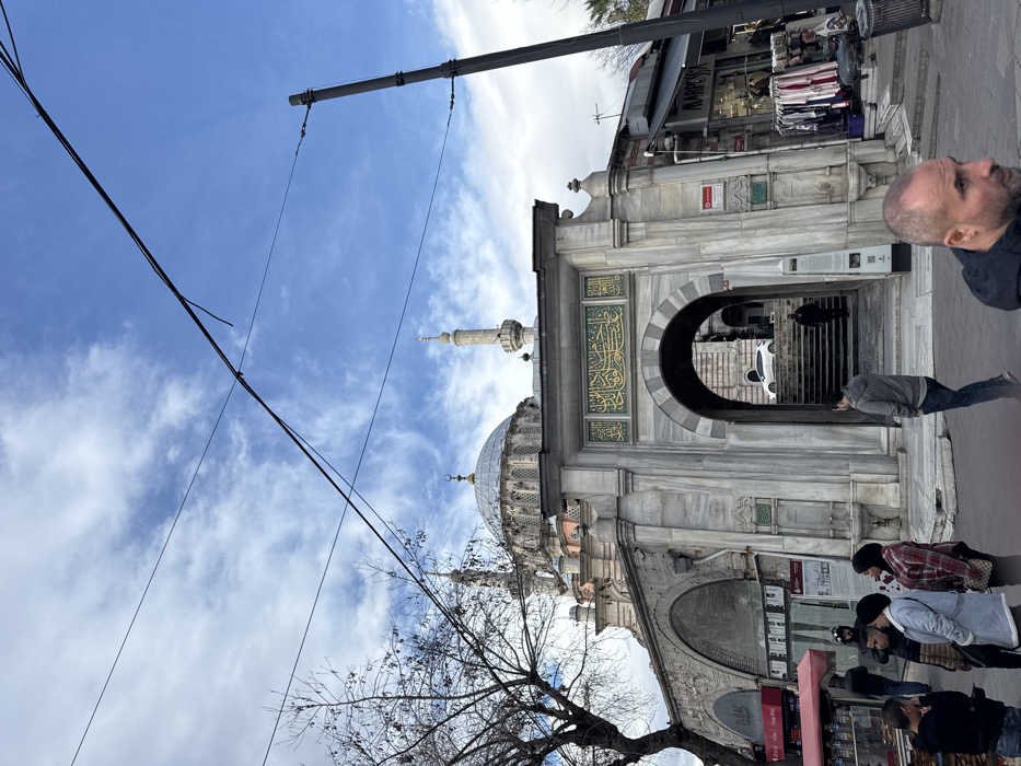 The image depicts an urban street scene in Istanbul, Turkey, featuring the prominent Nuruosmaniye Mosque and its ornate marble gateway
