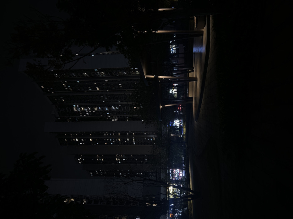 The image displays a nighttime urban landscape within Huangpu District, China. Multiple high-rise residential or commercial buildings, characterized by numerous illuminated windows, form the dark silhouette of the city skyline in the background against a dark sky. In the midground, a modern, open-air pergola or shelter structure is visible on the right, featuring several vertical support columns and internal lighting illuminating its base and a section of the paved ground beneath it. A paved pathway curves through the dark foreground and midground, leading into a landscaped park area. Scattered trees and shrubs, mostly silhouetted against the ambient light, populate the park. Distant artificial lights, indicative of street activity or commercial establishments, are discernible beyond the park vegetation in the mid-left and mid-right. The foreground is largely obscured by darkness, suggesting grassy or low-lying groundcover. No individuals or discernible activities are present within the frame.