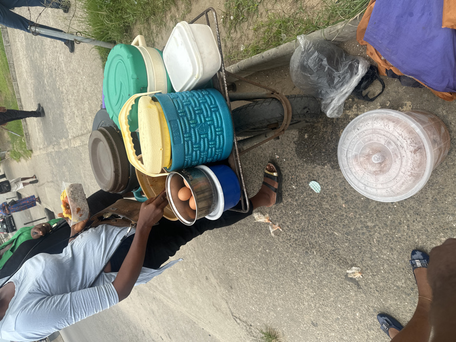A street vendor stands next to a cart loaded with stacked containers, presumably containing food. The cart's wheel is visible. The vendor is holding a package of food in one hand and a metal bowl with two eggs in the other. Beside the cart is a large bucket with a lid. The area is on the sidewalk. A few other people are visible in the background.
