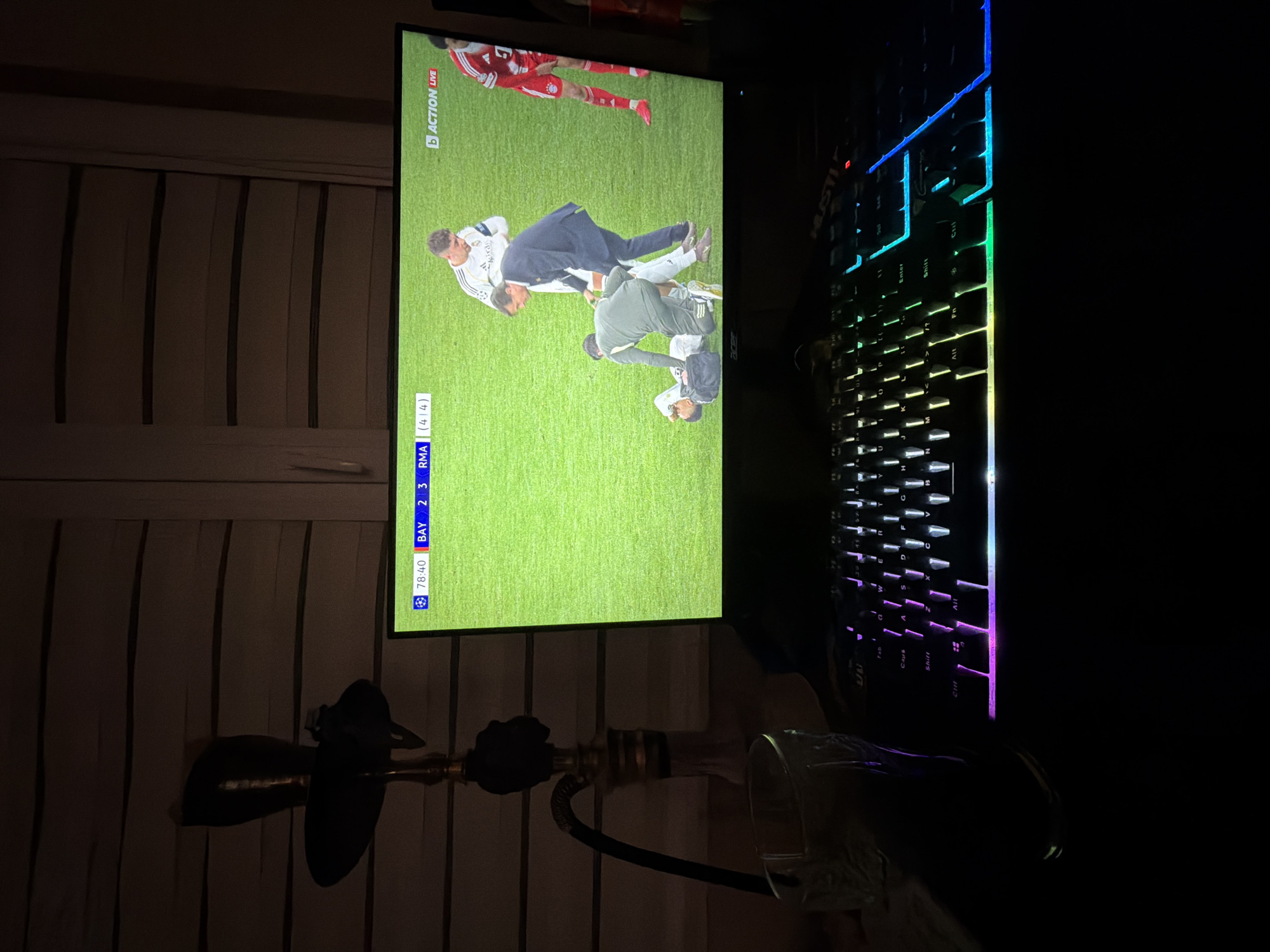 The image depicts a person watching a football (soccer) match on a screen. The game being shown is Bayern Munich vs Real Madrid, with the score at 2-3 for Bayern in the 78th minute and 40 seconds (aggregate score 4-4). A hookah sits in front of the screen, alongside a keyboard with colorful backlighting. The location, Buhovo, Bulgaria, is not discernible from the image.