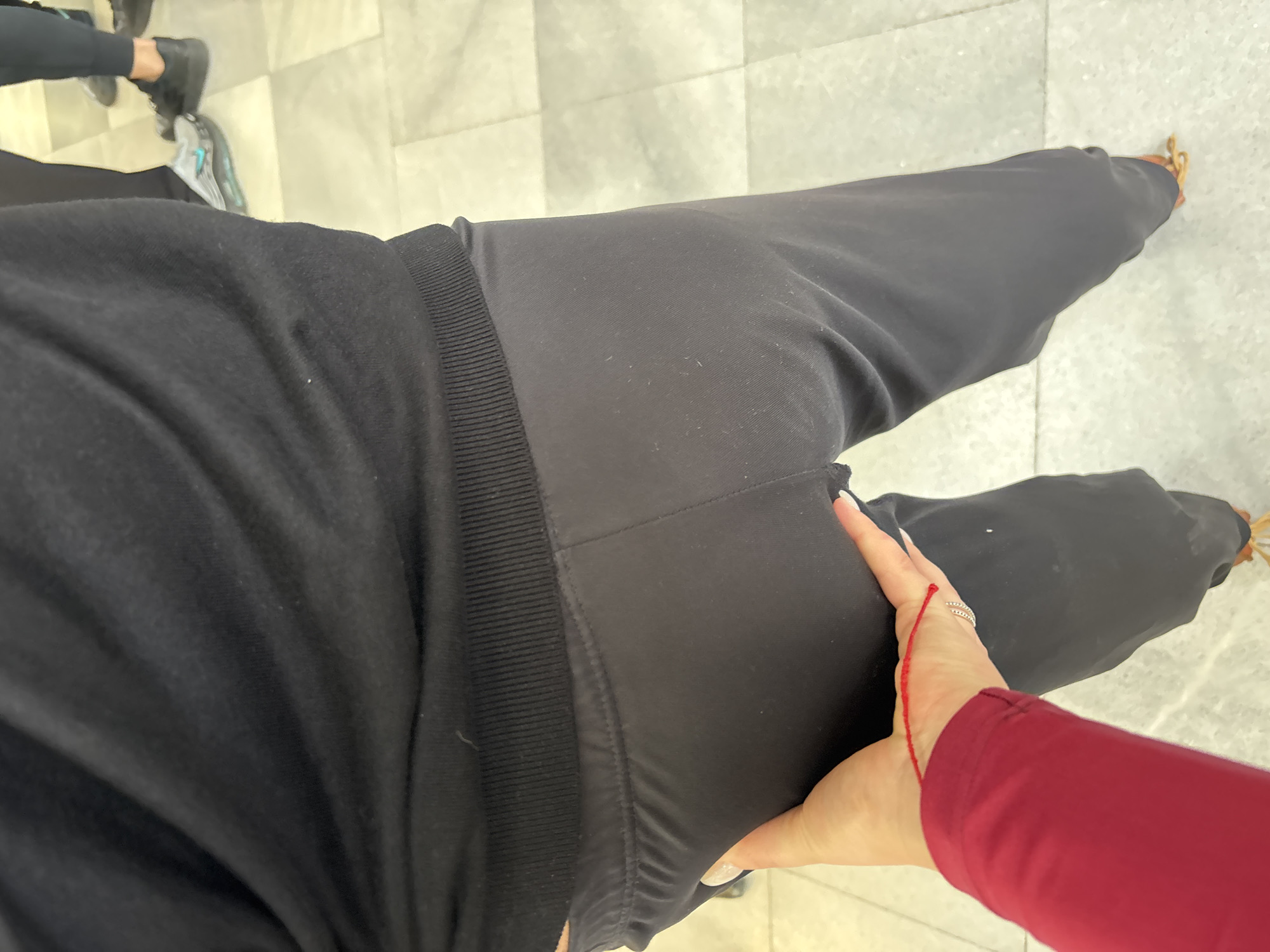 Here is a description of the image: The image shows a person wearing black clothing, including pants with a ribbed waistband. The person is standing on a light-colored tiled floor. Another person's hand, adorned with a red string bracelet and a ring, is touching the person's thigh. The clothing appears to be of a stretchy, comfortable material. Other people's feet, shod in dark shoes and sneakers, are visible in the background. The scene is indoors, likely a store or a home. It is not possible to identify the specific location in Sofia, Bulgaria, based on the provided image alone.