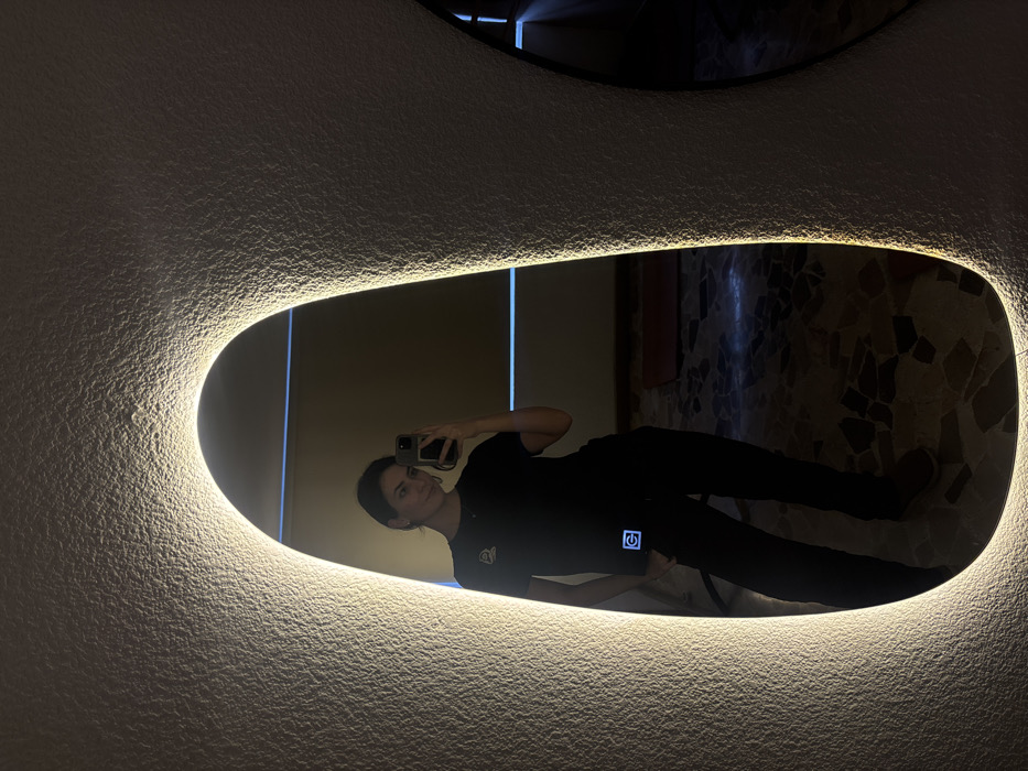A woman in a black outfit takes a mirror selfie. She holds her phone up to capture her reflection in an oval-shaped mirror with a glowing edge. The mirror is mounted on a wall with a textured surface. Behind her reflection, a tiled floor and portions of a room are visible. Another portion of a separate mirror hangs above the main oval mirror.